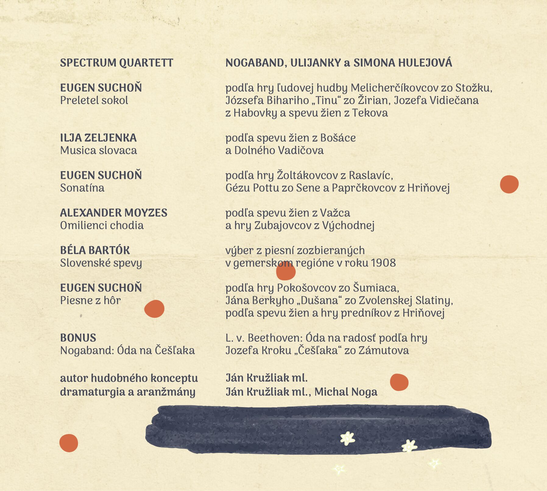 Myšlienka projektu Obrázky zo Slovenska vznikla z môjho komplikovaného prerodu z folkloristu na klasického muzikanta, niekoľkoročnej empírie v prostredí klasickej hudby a z prahnutia po návrate k folklóru. Narodil som sa v rodine folkloristu a huslistu. Môj otec, Ján Kružliak pochádza z Vígľaša a je výrobca ľudových aerofónov (píšťal, koncoviek, fujár) a upravovateľ ľudových piesní. Štyridsať rokov bol druhým huslistom v Orchestri ľudových nástrojov Slovenského rozhlasu. Samozrejme, prihlásil ma na základnú umeleckú školu, no folklóru som sa začal venovať až ako dvanásťročný. Prišiel čas rozhodovania: konzervatórium alebo gymnázium? Mama, ekonómka, odporúčala gymnázium. Otec, profesionálny hudobník, neprotestoval. Netušil som, ako funguje konzervatórium, ani čo musí huslista spĺňať, aby sa tam dostal. Otec, ktorý vyštudoval hru na husliach na konzervatóriu a hudobnú vedu na Univerzite Komenského, mi paradoxne, za celé obdobie dospievania nepustil ani jedného svetového husľového virtuóza. Mal celkom slušnú zbierku platní populárnej rockovej hudby zo 60. až 80. rokov, ktoré však doma nikdy nepúšťal. Takmer denne som však počúval archívne nahrávky dedinských muzikantov a spevákov, ktoré transkriboval a používal vo svojich úpravách. Nastúpil som teda na gymnázium, ale pokračoval aj na ZUŠ. Dôležitým medzníkom v mojom muzikantskom živote bolo, keď som sa stal primášom Folklórneho súboru Lipa (bývalý Dimitrovec). Otvoril sa mi svet ľudovej hudby, do ktorého som sa začal intenzívne ponárať: počúvať, transkribovať melódie, ornamenty, harmóniu. Táto hudba ma fascinovala, fascinuje, napĺňa a prekvapuje dodnes. Repertoár FS Lipa bol po vzore Lúčnice postavený na partitúrach od významných slovenských upravovateľov folklóru. Uvedomoval som si, že tento prístup nie je úplne v súlade s nahrávkami, ktoré som poznal, ani s hrou ľudových kapiel, no umožňoval kvalitatívny rast celej kapely a cizelovanie súhry. Samozrejme, aj vnášaním autentických elementov hry ľudových kapiel do interpretácie podľa nôt. Práca nás všetkých bavila až do momentu, kedy sa z mojich spoluhráčov – študentov stali pracujúci. Nácviky a vystúpenia sa začali meniť na zábavu, prístup k muzikantskej sebareflexii začal devalvovať a narúšať mnou cenenú kvalitu. Rozhodnutie odísť bolo správne, aj keď dodnes nerozumiem sile, ktorá mnou natoľko pohla, že som opustil svet, ktorý mi bol najbližší a najviac ma napĺňal. Ruka v ruke s tým som sa ocitol na prahu ďalšieho životného míľnika: po gymnáziu som nastúpil na Ekonomickú univerzitu, ktorú som najmä z dôvodu neustálej muzikantskej zaneprázdnenosti nedokončil. Do portfólia mi totiž pribudla kapela Zuzany Mojžišovej Jej Družina, ktorá v tom čase ako jedna z prvých začala s prerábaním ľudových piesní na spôsob world music. Bol som vystavený novej výzve: improvizovať na ľudové témy v modernej kapele. Keď som ako 22-ročný po nedokončenom vysokoškolskom štúdiu ostal na pochybách, čo budem v živote robiť, všetky cesty ukazovali na hudbu. Prijali ma na Cirkevné konzervatórium. Tam začala úplne nová kapitola môjho hudobníckeho života. Štúdium na konzervatóriu som si predstavoval ako štúdium hudby, muzikantstva. Čoskoro som sa však prebral z omylu. Bola to tvrdá práca, fyzická aj psychická. Môj profesor Milan Vonderka ma učil novému držaniu tela i rúk, porozumeniu klasickému zápisu, zároveň som objavoval umenie husľových virtuózov. Začal som prenikať do žánru, ktorému moji spolužiaci už dávno rozumeli. Mal som pocit, že už neviem hrať ani folklór, ale ani vážnu hudbu. Absolventskú prácu som napísal o vzťahu ľudovej a klasickej hudby – niekde v tom čase sa objavil zárodok myšlienky projektu Obrázky zo Slovenska. Napriek odmietavému postoju profesora som sa prihlásil na VŠMU, kam ma prijali. Otvoril sa mi nový svet, ktorý sa viac podobal na to, čo som si predstavoval pod štúdiom hudby. Vďaka Petrovi Zajíčkovi som si zamiloval historicky poučenú interpretáciu, prostredníctvom Daniela Mateja som spoznával súčasnú hudbu. Pre festival Orfeus sa každoročne vytvorilo teleso, ktoré novú tvorbu mojich spolužiakov – skladateľov uvádzalo. Práve tu sa začalo formovať Spectrum Quartett. Rok 2012, keď sme premiérovali niekoľko súčasných skladieb na festivale Soozvuk, považujem za rok nášho založenia. Začali sme objavovať súčasný aj klasický repertoár – samozrejme aj sláčikové kvartetá slovenských skladateľov inšpirovaných ľudovou hudbou – Eugena Suchoňa, Ilju Zeljenku, Alexandra Moyzesa, Alexandra Albrechta. Ľudové piesne v ich dielach som dôverne poznal. V mojej hre sa celkom prirodzene objavovali štýlové znaky interpretácie folklóru. Dokonca som sa ich snažil akcentovať, aby som sa odlíšil od iných interpretov. Som presvedčený, že je to správna cesta vychádzajúca z poznaného. Avšak vo svete klasickej hudby, najmä na Slovensku, stále prevláda názor, že ľudová hudba je istým spôsobom menej hodnotná a degraduje techniku. Toto vnímanie je podľa mňa mylné a vyplýva z nedostatku poznatkov a skúseností s interpretáciou ľudovej hudby. Osobne považujem poznanie starých herných štýlov za obohacujúce. Zvlášť hráči v rómskych a maďarských kapelách ovládajú svoje nástroje s virtuozitou a ich repertoár by študentov hudby obohatil podobne ako ktorákoľvek etuda alebo capriccio. Je zároveň paradoxom, že sa na VŠMU od roku 1979 vyučuje pedagogika a choreografia ľudového tanca (nehovoriac o modernom a jazzovom tanci). Študenti sa vzdelávajú aj zo starých výskumných videozáznamov a po piatich rokoch získavajú vysokoškolský titul, pričom pre hudobníkov podobná možnosť neexistuje. VŠMU som ú
